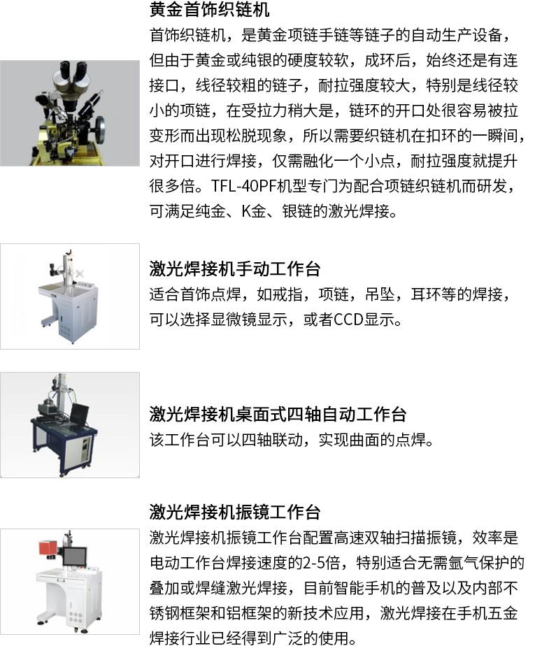 通發(fā)激光研發(fā)針配合黃金織鏈機、K金制鏈機、首飾制鏈機的TFL-80PF自動激光焊接機,焊接機采用能量反饋技術,光點穩(wěn)定,能量強勁,實現(xiàn)一環(huán)一焊的功能,確保金鏈的耐拉強度。本激光焊機實現(xiàn)了水冷一體的小型化結構。適用于各種生產(chǎn)場所。