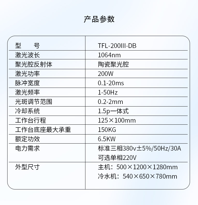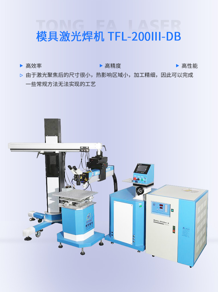 TFL-200Ⅲ-DB型模具激光焊機(jī)是通發(fā)激光公司在TFL-180Ⅲ的基礎(chǔ)進(jìn)行了改良,采用通發(fā)自主研發(fā)的二代精密單燈電源為燈泵浦驅(qū)動(dòng)電源,操作更方便。主機(jī)具備激光頭手搖升降與工作臺(tái)按鈕電動(dòng)升降實(shí)現(xiàn)焊接不同厚度模具的激光焊加工。本款機(jī)型更適用于各類高精密注塑模具激光補(bǔ)焊,精密塑膠模具零件激光修補(bǔ),塑膠模具鈹銅零件激光燒焊;可對(duì)模具使用過(guò)程中出現(xiàn)的磨損進(jìn)行激光修復(fù);對(duì)機(jī)械加工失誤、電火花加工失誤,模具減膠設(shè)計(jì)變更等需要對(duì)模具修改,起到關(guān)鍵的作用,可彌補(bǔ)應(yīng)加工失誤造成的巨大損失。